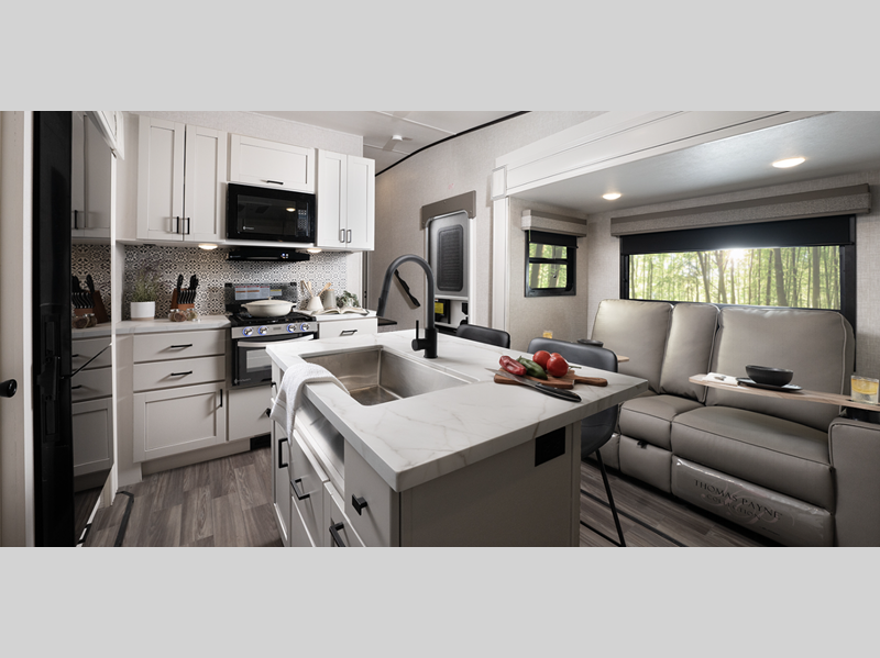 Sleeps 6 Slides 2 Length 33 ft 7 in Ext Width 8 ft 4 in Ext Height 13 ft 2 in Int Height 8 ft 5 in Interior Color Coastal Linen Hitch Weight 1540 lbs GVWR 10600 lbs Dry Weight 8825 lbs Cargo Capacity 1775 lbs Fresh Water Capacity 55 gals Grey Water Capacity 60 gals Black Water Capacity 30 gals Tire Size ST235/80R16E Furnace BTU 30000 btu Number Of Bunks 1 Available Beds Queen Refrigerator Type 12 Volt Refrigerator Size 10 cu ft Cooktop Burners 3 Number of Awnings 2 LP Tank Capacity 20 lbs. Water Heater Capacity 6 gal Water Heater Type Quick Recovery Gas/Electric AC BTU 15000 btu TV Info LR Smart HDTV Awning Info 11' & 13' Power w/LED Lighting Axle Count 2 Number of LP Tanks 3 Shower Type Standard Electrical Service 50 amp Similar Floorplans