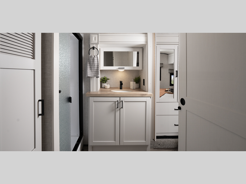 Additional stand-out features include the Thermal Seal zero-degree tested weather protection, Xtend l Solar Package for off-grid capabilities, and an on-demand water heater for endless hot showers! Each fifth wheel is outfitted with high sheen handcrafted door/drawer fronts, residential vinyl flooring throughout, solid surface countertop(s), and blackout roller shades with reflective sides throughout.